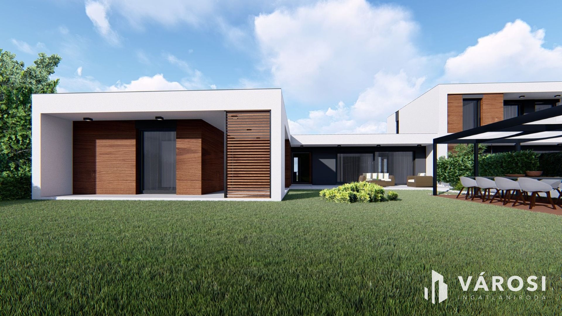 A földszintes, remek elrendezésű, ideális -DNY-i- tájolású nappali+3 hálószobás lakás nettó hasznos lakóterülete 126,29 m2, melyhez összesen 63,61m2 terasz és egy 39 m2 alapterületű dupla gépkocsibeálló tartozik, 585 m2 önálló saját telekrészzel.