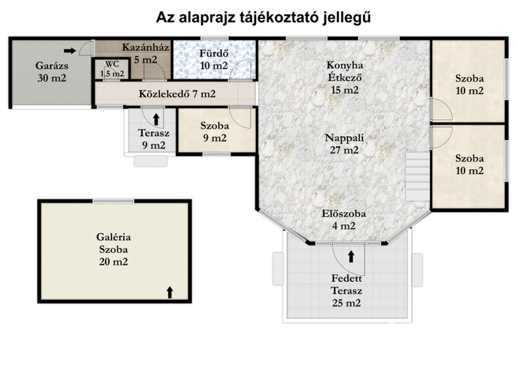 Belépve az ingatlanba egy 46 nm-es amerikai konyha–étkező–nappali tér fogad, amely azonnal magával ragad. A magas belmagasság lehetővé tette egy amerikai stílusú galéria kialakítását, ahol egy 20 nm-es szoba kapott helyet, különleges rálátással a nappalira – tökéletes gyerekszoba, dolgozósarok vagy vendégtér. A nappali, a konyha és az étkező ugyan egy légtérben helyezkednek el, mégis a minőségi burkolatok finoman tagolják a funkciókat.
