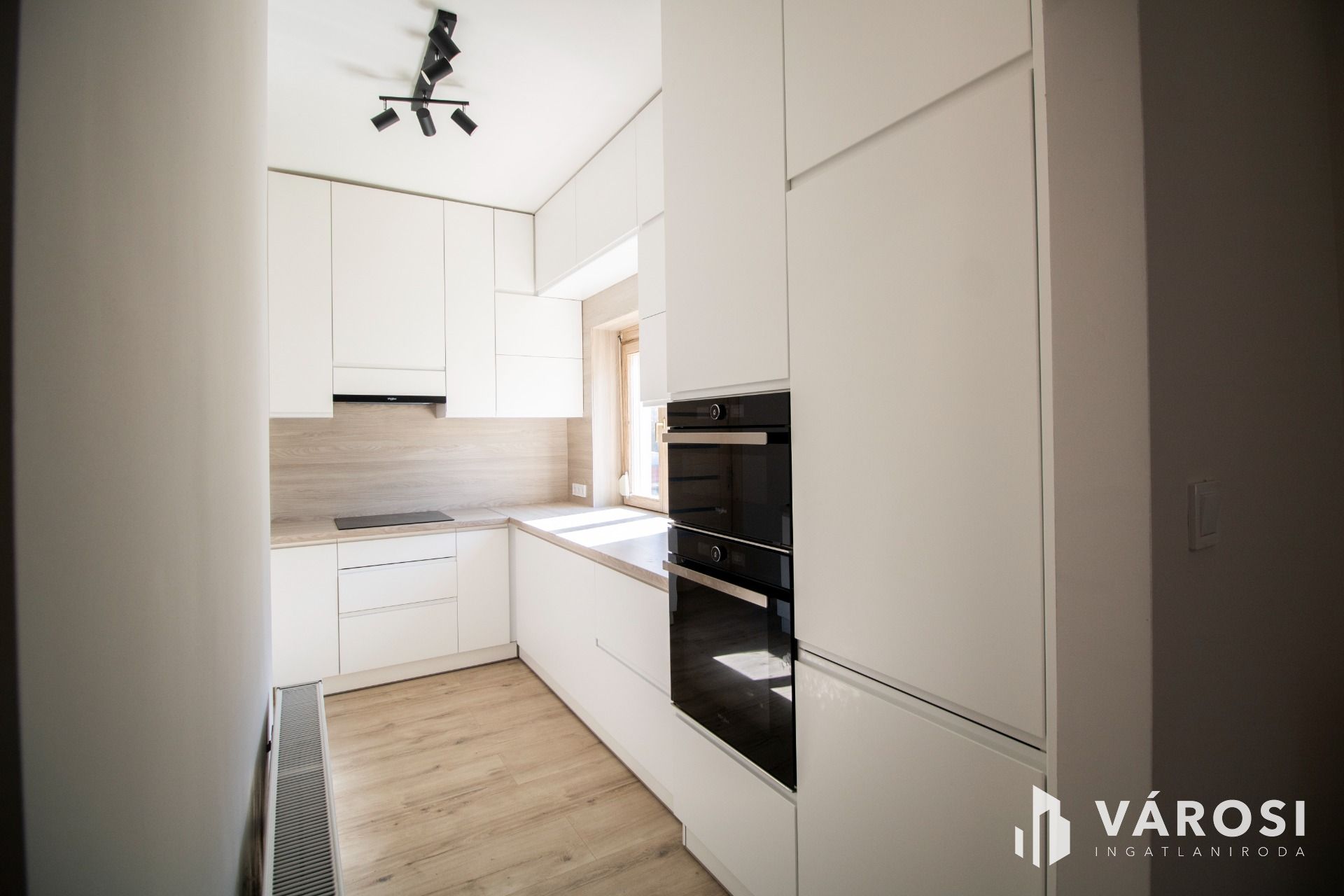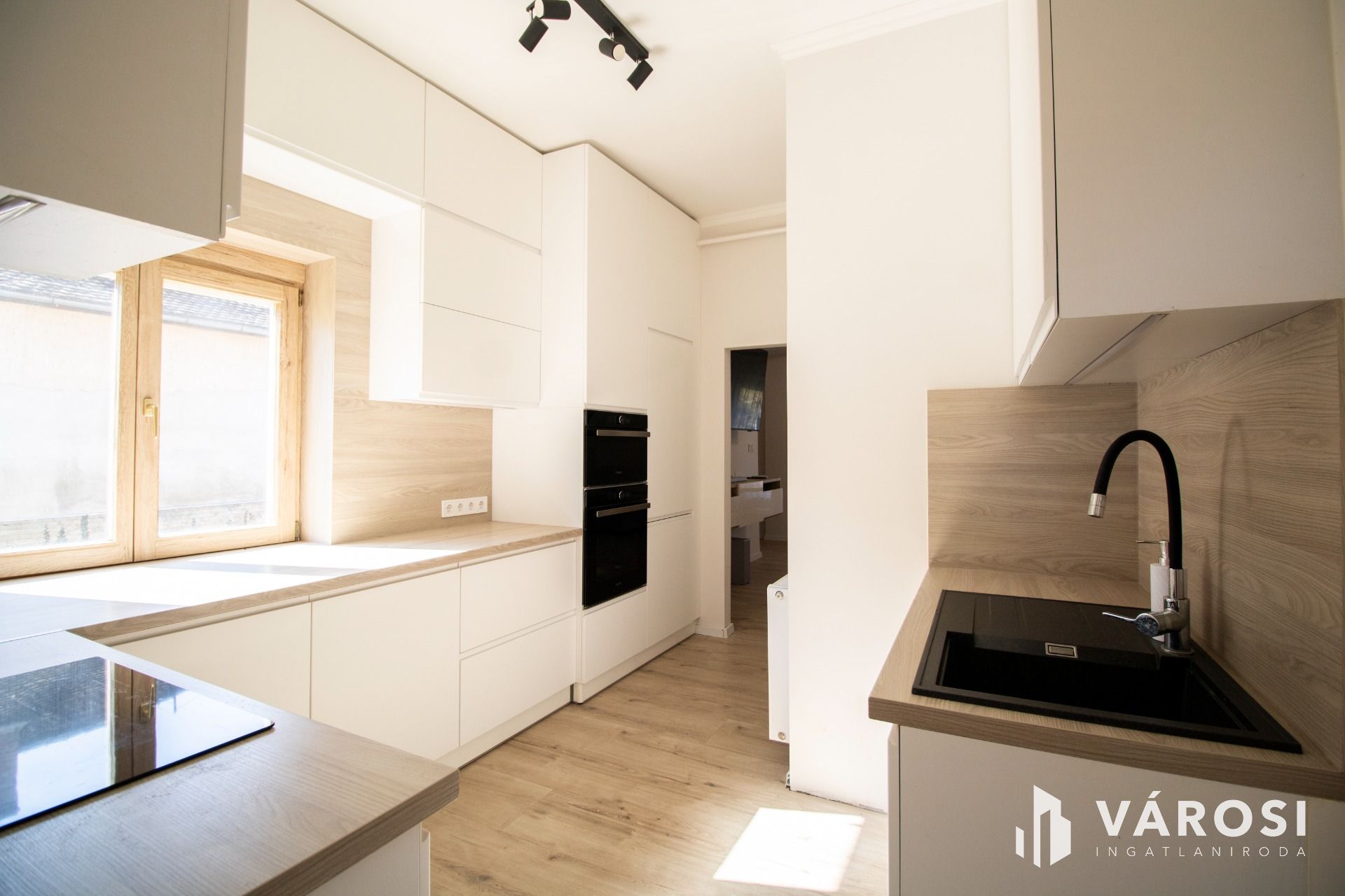 A konyha az ingatlan egyik kiemelkedő pontja, hiszen magasfényű fehér konyhabútor került beépítésre mennyezetig kialakított tárolókkal és teljes gépesítéssel. Az elektromos főzőlap, a sütő, a gránit mosogató, a beépített hűtőszekrény és a mosogatógép mind a konyha részét képezik.