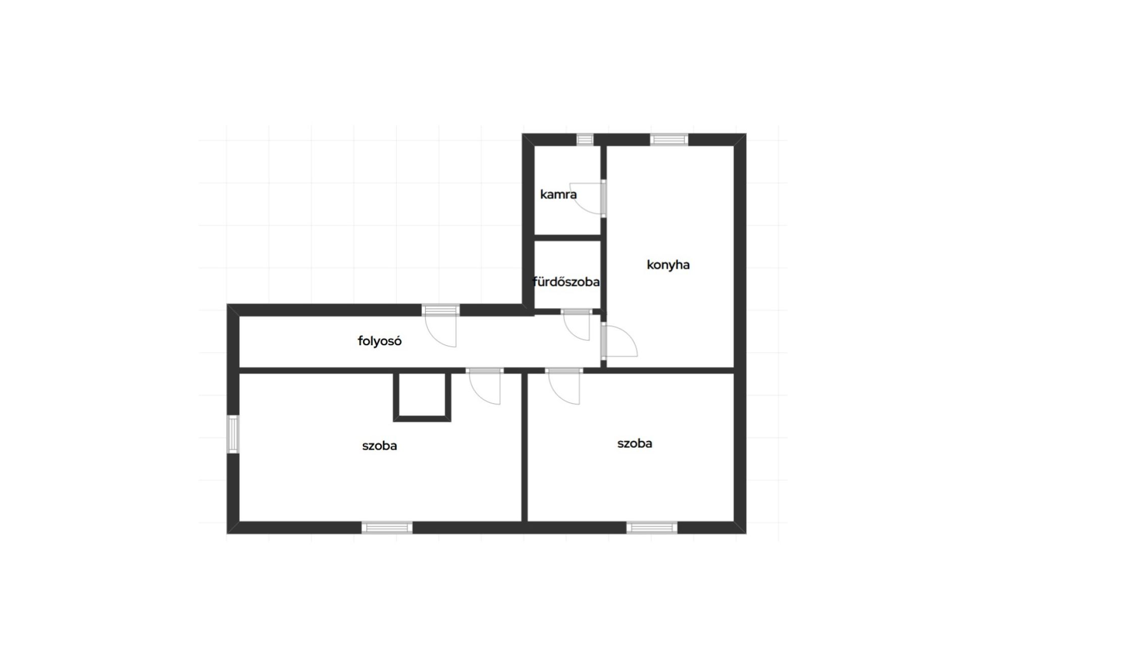 -előtér, konyha, kamra, 2 szoba, fürdőszoba WC-vel, kis pincerészből áll,