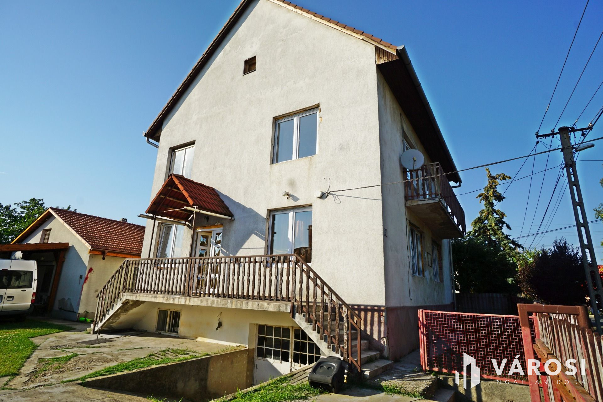 160 m2-es családi ház, 70 m2 pincével, 60 m2-es melléképülettel.