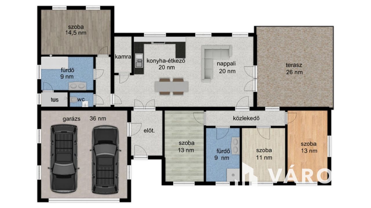 - Lakótér 136 nm, garázs 36 nm, terasz, 26 nm.