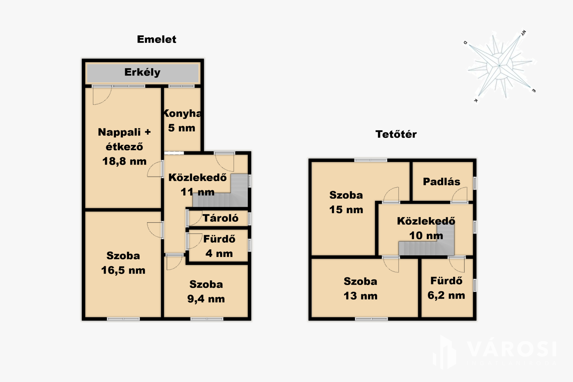 A felső szinten 2 darab nagy méretű szoba található, valamint tágas kádas fürdőszoba WC-vel, 43 négyzetméteren. Innen közelíthető meg a tárolásra alkalmas kis padlástér is.