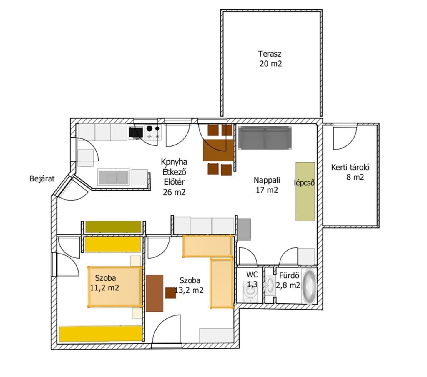 A 799 m²-es telken egy 30 m2 es , szintén hőszigetelt melléképület is helyet kapott, amely további lehetőségeket rejt magában. A 20 m2-es teraszról, amely közvetlen kertkapcsolattal bír, élvezheti a természet közelségét,a vezetékes víz mellett az ásott kút a kertészkedéshez nagy segítség, miközben az udvari gépjárműbeálló megoldja a parkolást.
