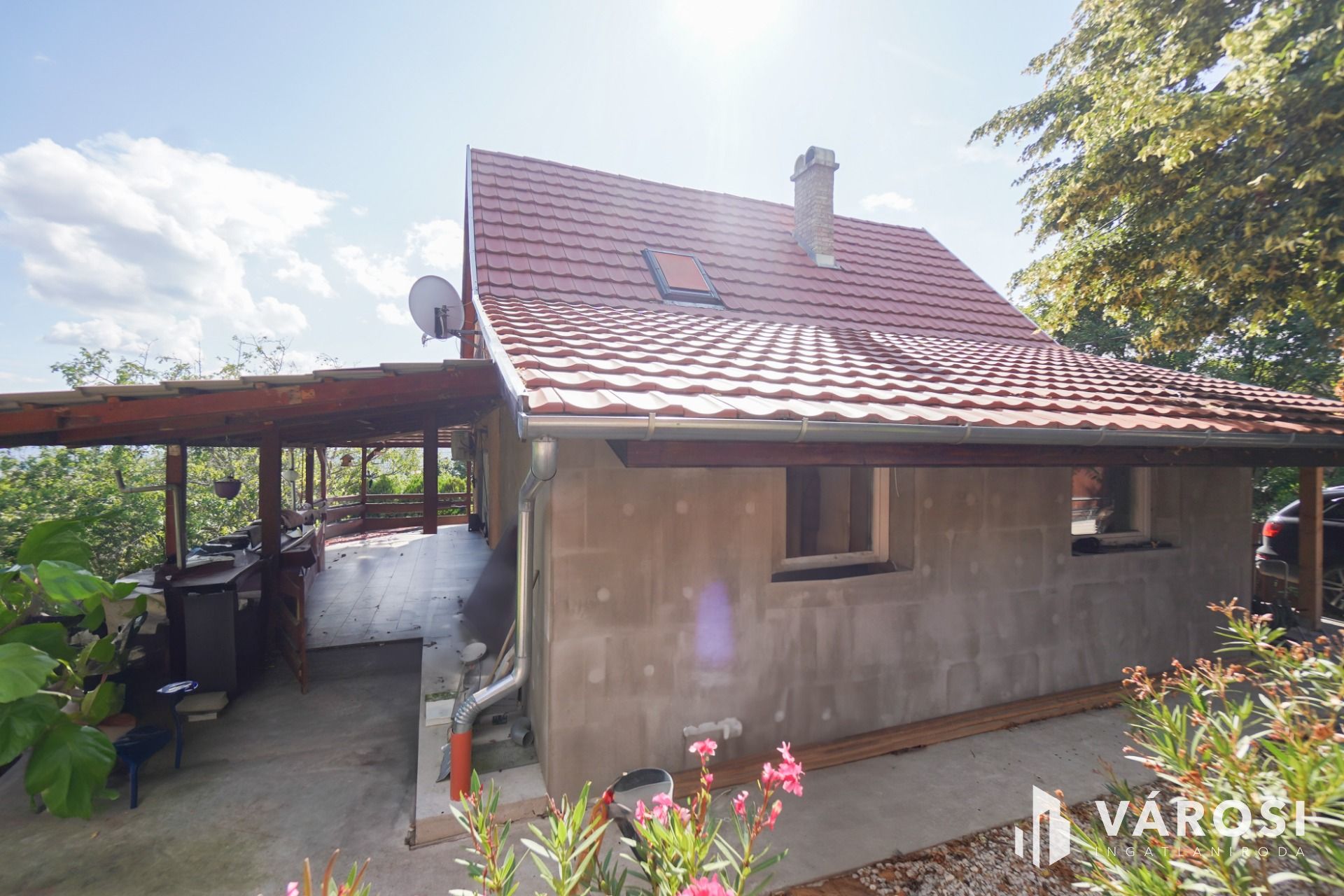 -áram és víz bevezetve, gázcsonk a telken belül, csatorna helyett derítő