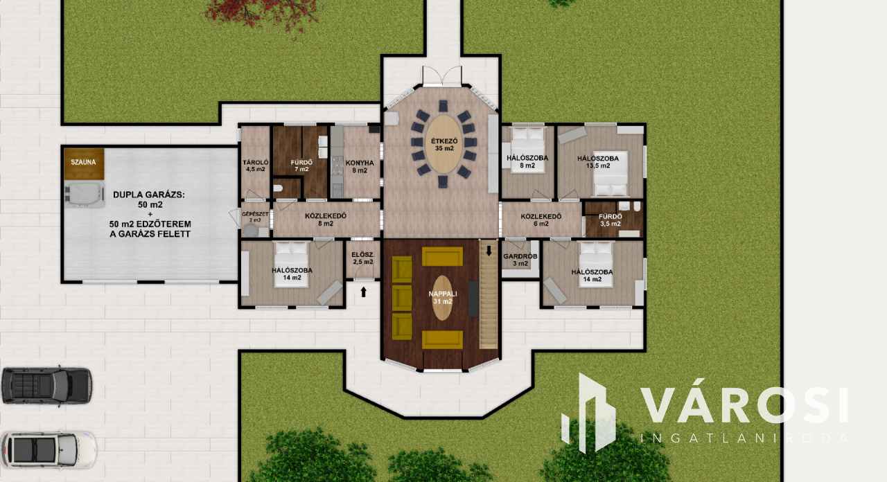 Abszolút meghatározóak a nagyvonalú terek: nappali 31 m2, étkező + konyha: 43 m2.
