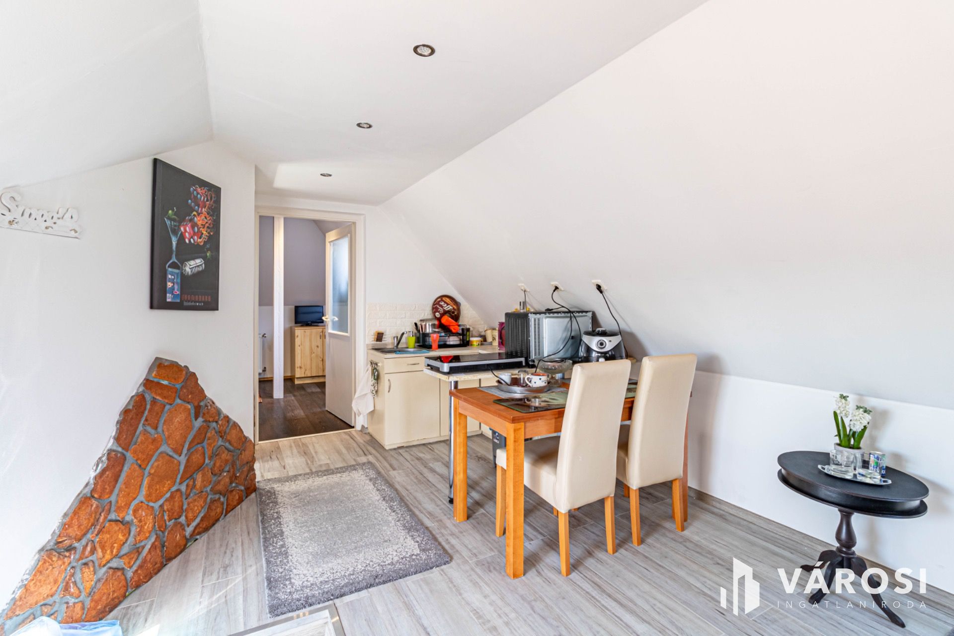 Az ingatlan alsó szintjén a tágas nappali - amely egy hangulatos ERKÉLYRE nyílik - kitűnő helyet biztosít a családi összejövetelekhez, közös étkezésekhez vagy egyszerűen csak pihenéshez. Emellett itt található egy hálószoba, jól felszerelt konyha, előtér és modern fürdőszoba WC-vel, amelyek mind a kényelmes mindennapokat szolgálják.
