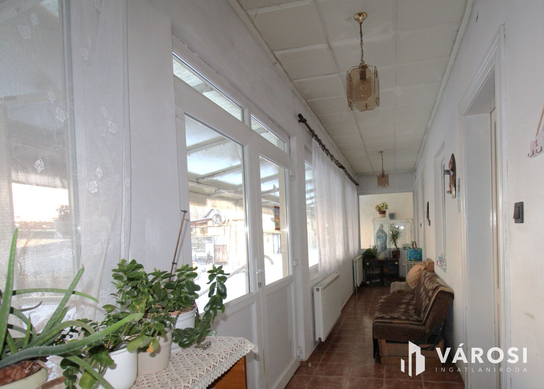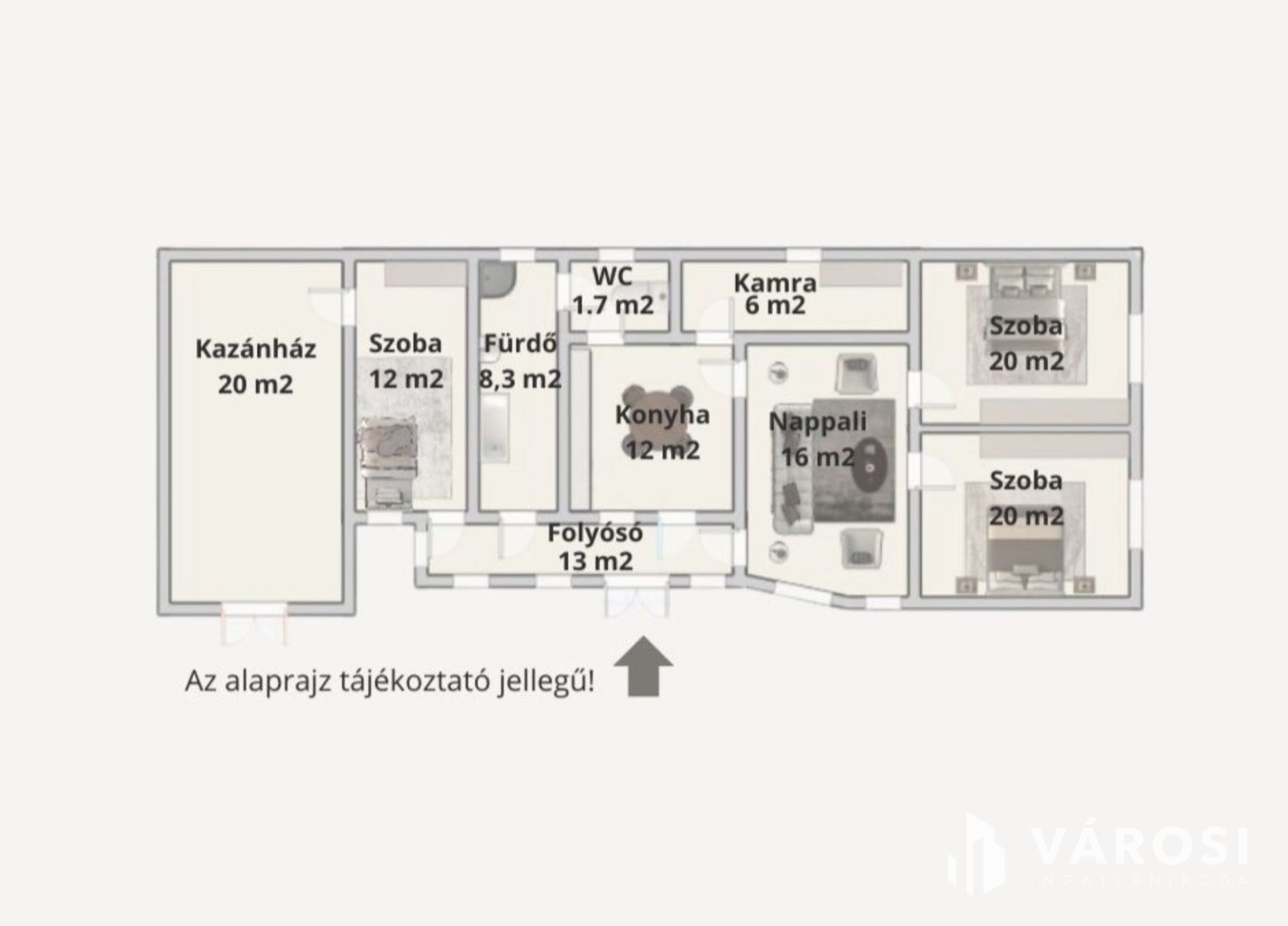 A ház hosszanti elrendezésű, központi közlekedővel, ahonnan minden helyiség külön nyílik – nincs áthaladó szoba, nincs feleslegesen elvesző terület.