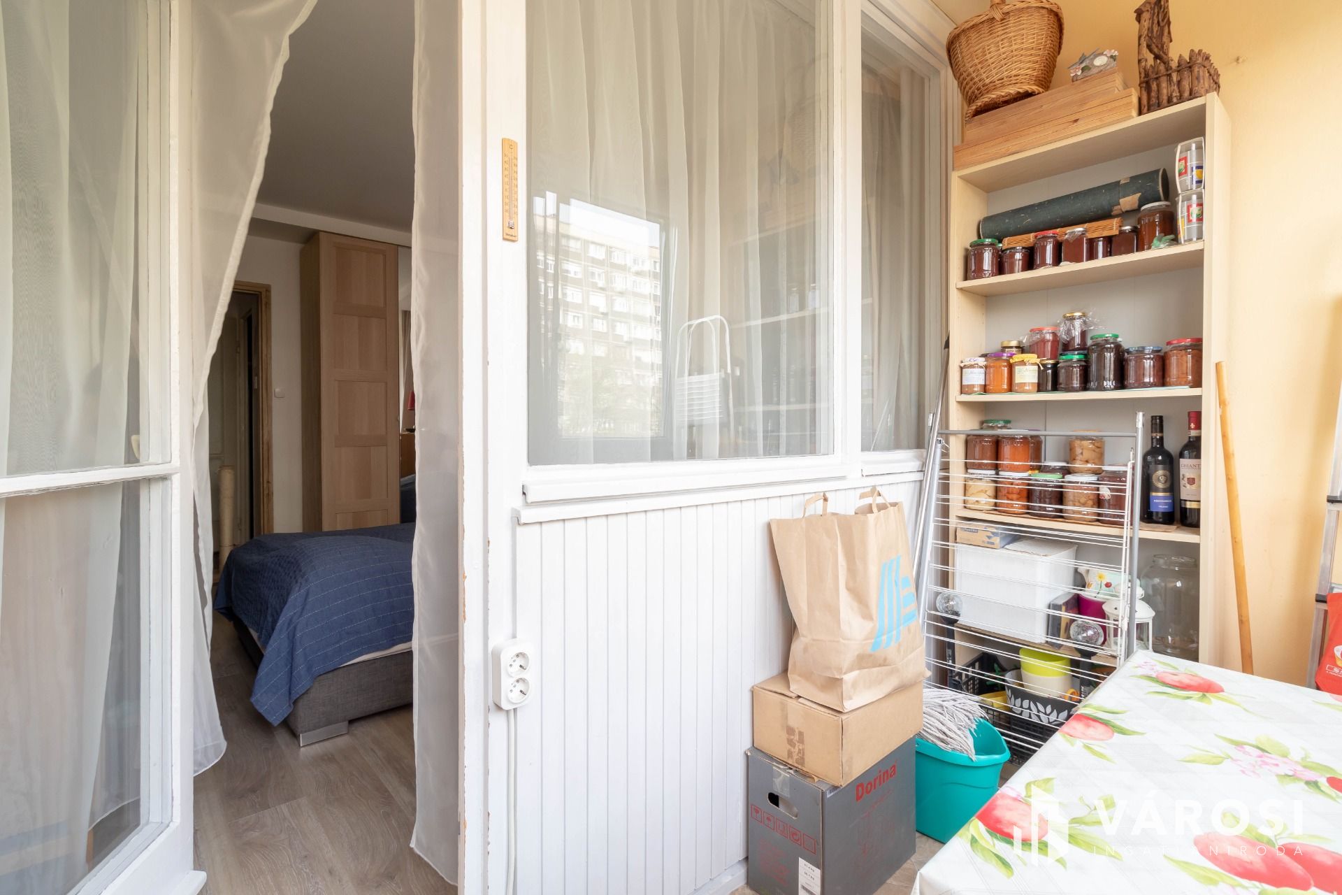 A nappali ablakai redőnyözöttek, a lakás minden ablaka szúnyoghálóval szerelt.